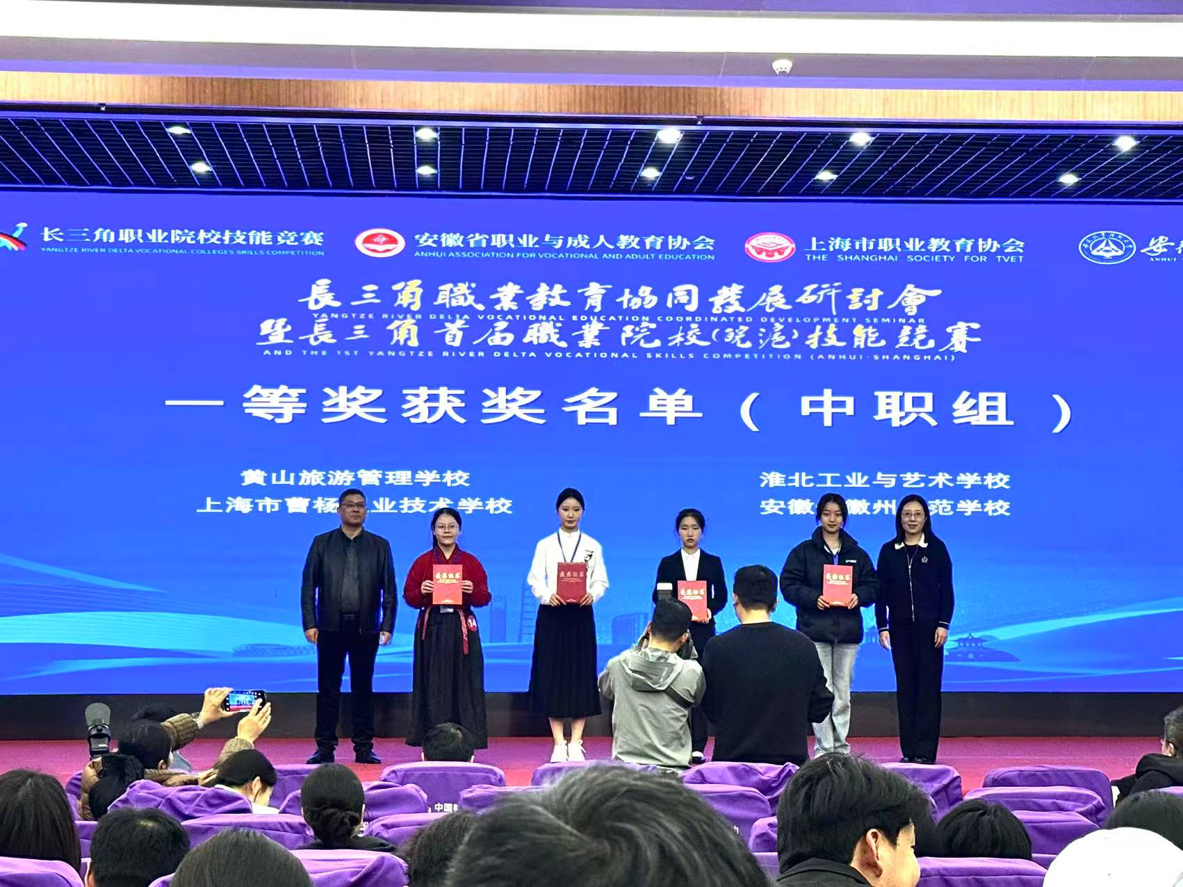 2025年12月7日,长三角首届职业院校(皖沪)技能竞赛“旅游目的地营销策划”项目比赛在安徽职业技术大学圆满落幕。来自沪皖两地的中职、高职院校37支精英队伍分两个组别竞技,经过激烈角逐,来自23会展中高班周纪萱、24会展中高班李佳怡、施小颖和25会展中高班刘依然四位同学的联合组队队伍,在盛蔚、黄晓明两位老师指导下,凭借以“上海农业文化旅游节”为核心的营销策划方案,在17支中职院校队伍中脱颖而出,成功斩获上海唯一一个一等奖,用实力彰显了我校会展专业优秀学子的专业素养与创新能力。