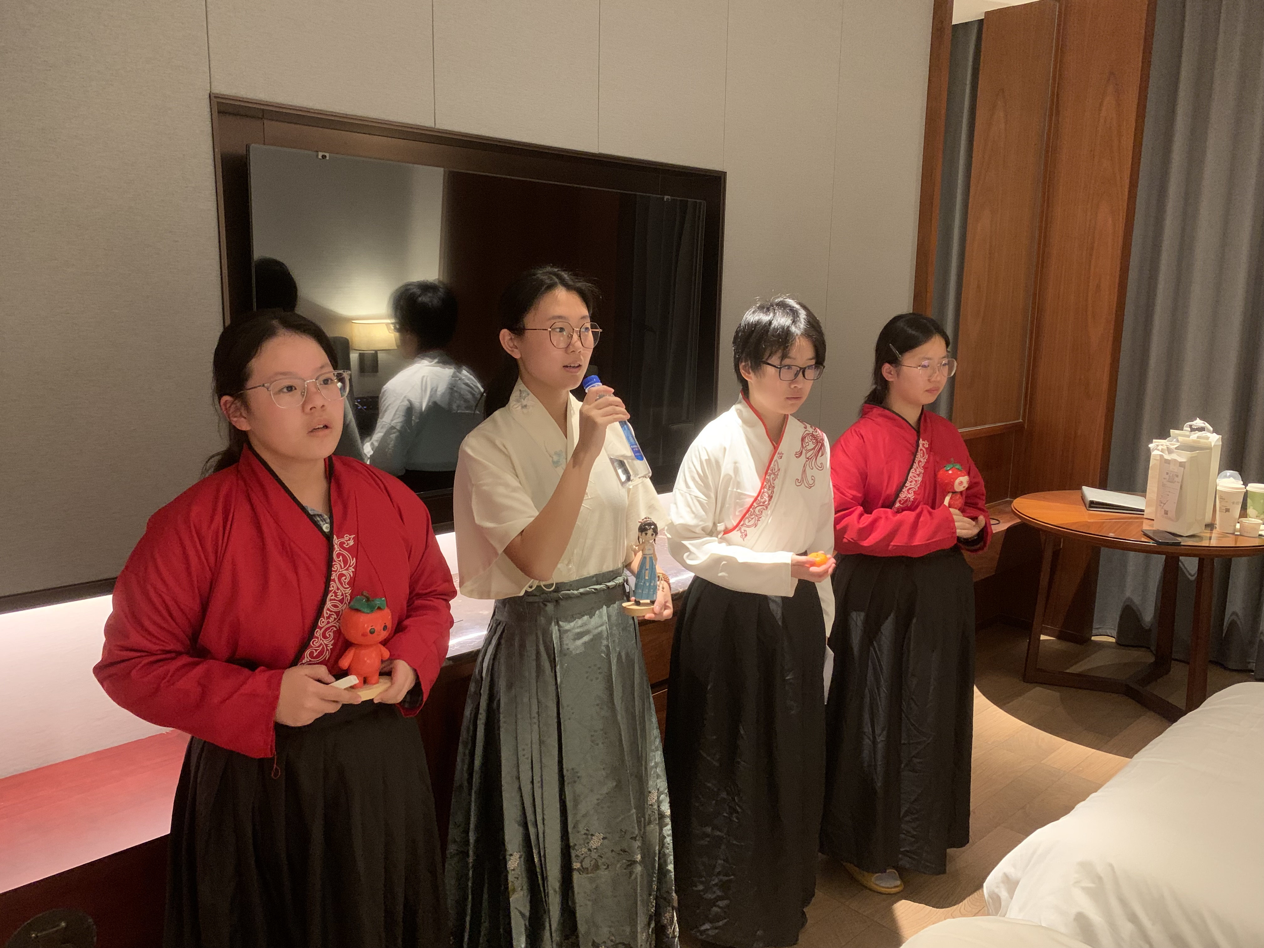 备赛期间,校园四楼会展实训室成了队员们最常互动的地方。每天放学后,当其他同学陆续离校,她们在老师的陪伴下投入研讨与训练,针对文稿的文字、数据、图片、分析点等反复核实,对演示方案的每页版式精心调整,围绕路演时的仪容、仪态、仪表、语速等不断练习。考虑到当下新媒体传播趋势,团队创新性地在方案中融入直播带货、短视频挑战赛、数智融合等多元推广形式,让传统农业旅游节焕发时尚活力。