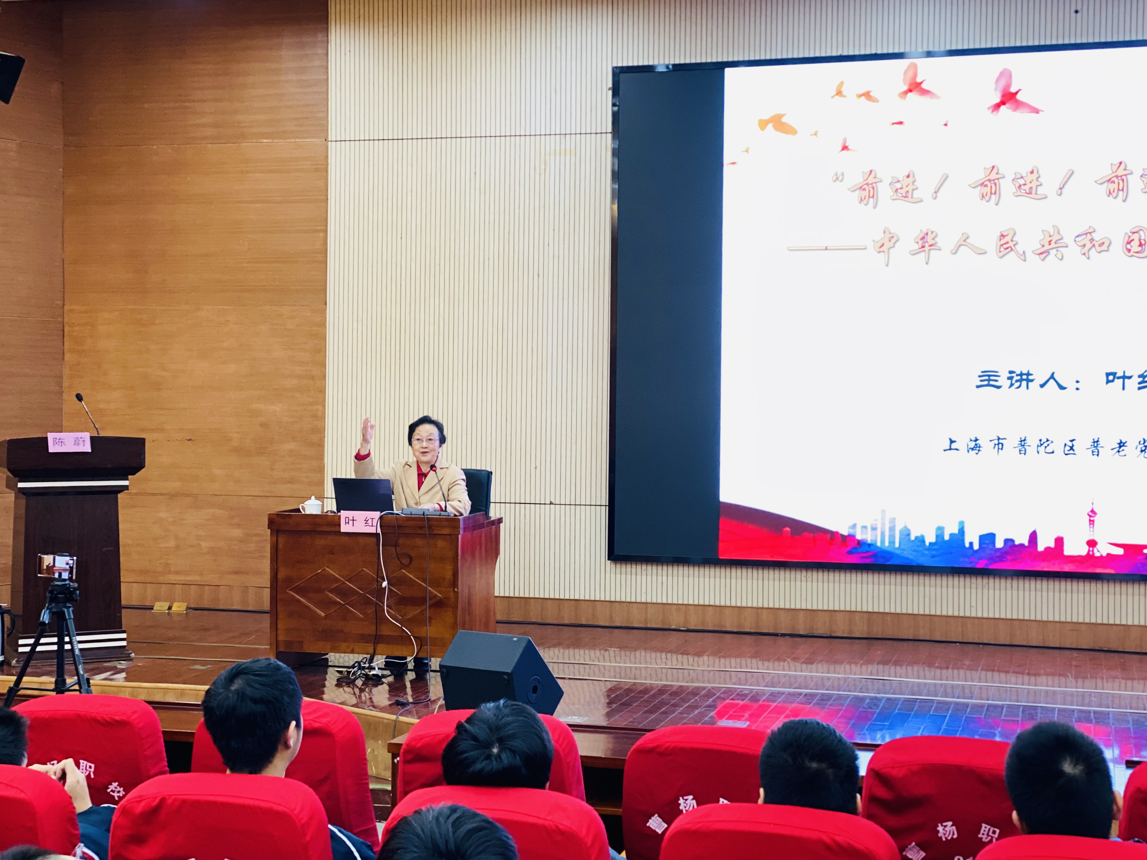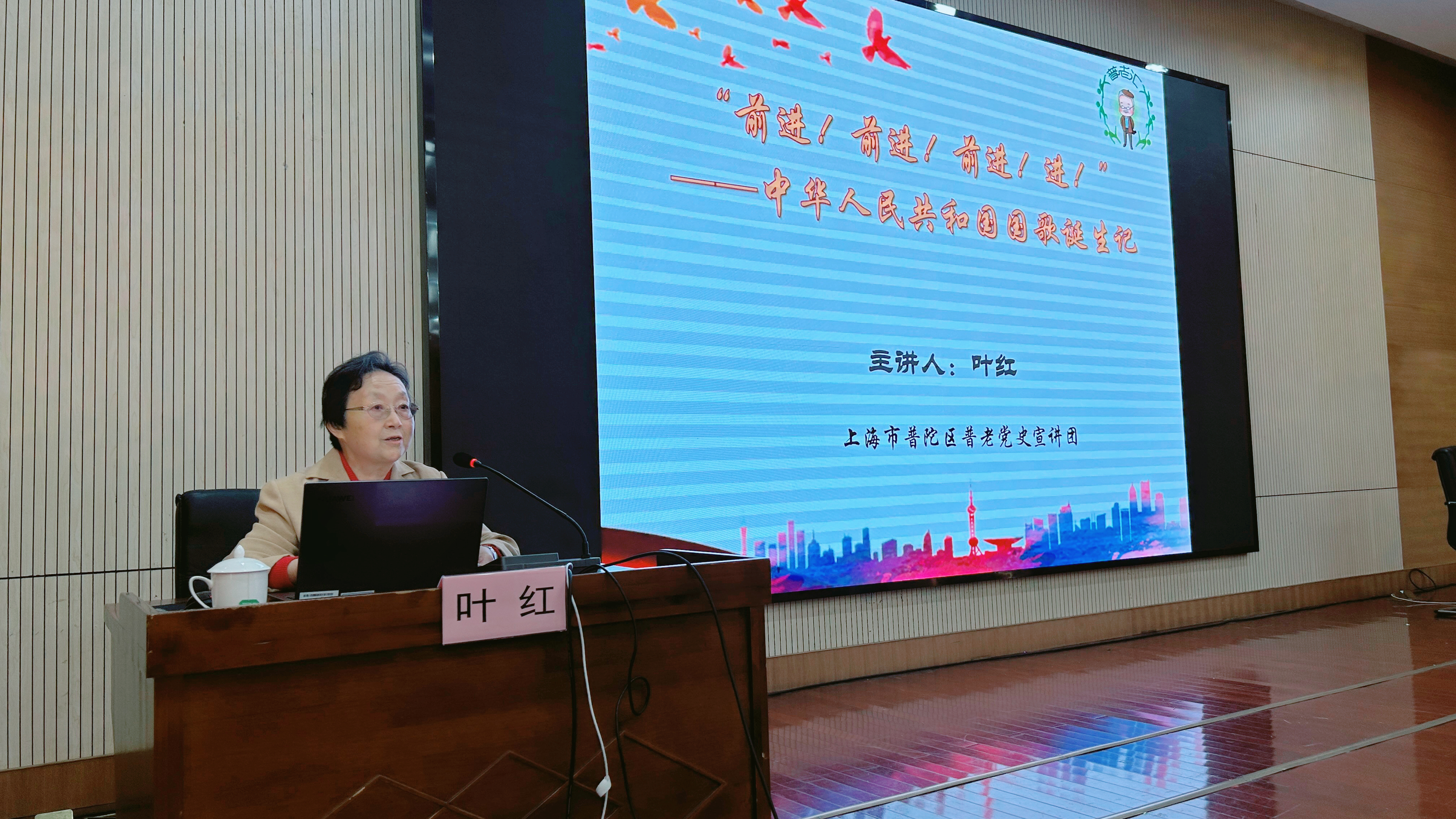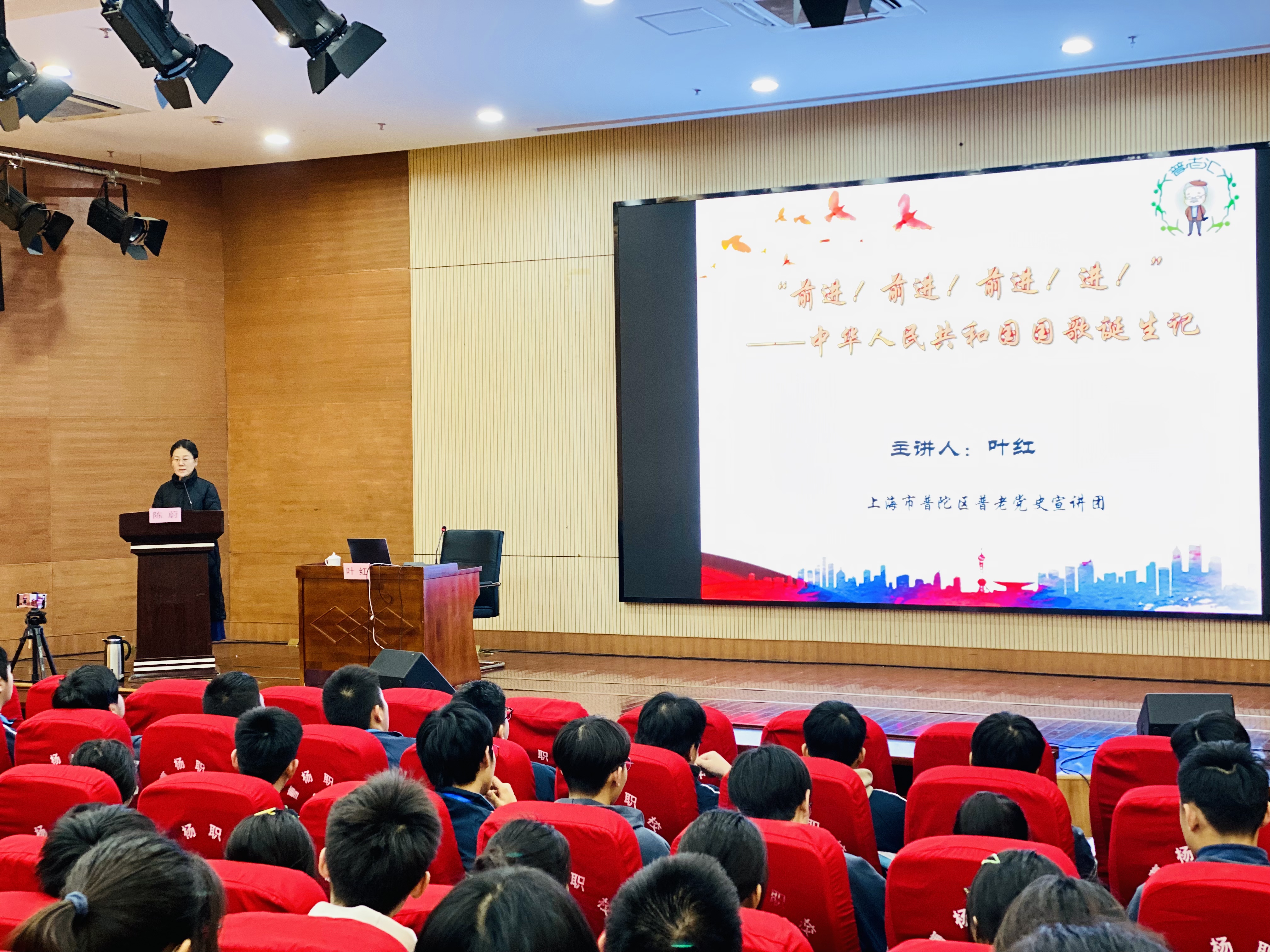 2024年11月18日上午8点,上海市普陀区普老党史宣讲团叶红团长受邀来到曹杨职校,作“中华人民共和国国歌诞生记”主题讲座,讲述国歌创作的艰辛历程,介绍国歌的艺术魅力和深刻影响。全体师生通过现场聆听、视频转播的形式,进一步知晓国歌的创作背景、诞生故事,感动之余红色精神悄然厚植于心。曹杨职校党总支书记陈蔚担任此次活动的主持人。
