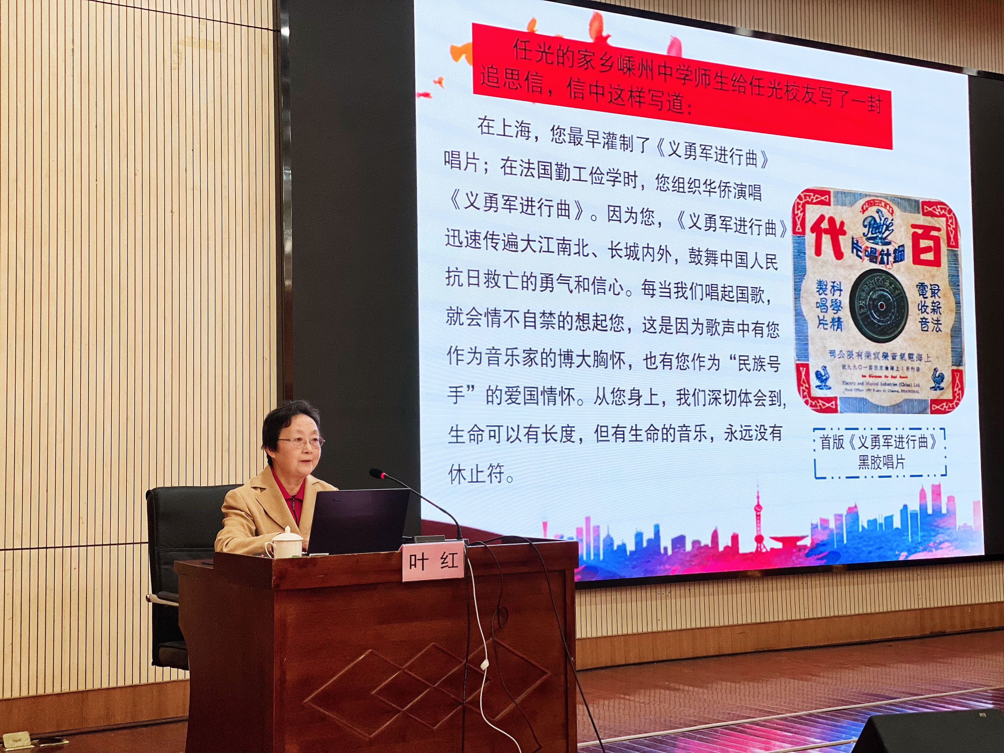 叶红讲到,中华人民共和国国歌是《义勇军进行曲》。中华人民共和国国歌是中华人民共和国的象征和标志。一切公民和组织都应当尊重国歌,维护国歌的尊严。国歌《义勇军进行曲》诞生于上海,出自中国电通影片公司拍摄的电影《风云儿女》的主题歌,很快成为中国最著名的抗战歌曲传唱全国。《义勇军进行曲》的词作者田汉、曲作者聂耳、唱片灌制传播者任光,他们创作立场鲜明,反映时代精神。新中国成立前,《义勇军进行曲》是中华民族反抗日本帝国主义侵略,争取民族独立解放的战斗号角;新中国成立后,《义勇军进行曲》又成为全国各族人民建设社会主义的强大精神动力。叶红娓娓道来,讲述着创作者的艺术作品和感人事迹,讲到动情之处,轻轻唱起歌词进行了现场演绎。通过讲授,大家深刻理解到,国歌不仅仅是一首歌曲,更是一个国家文化的精髓和民族精神的集中体现。