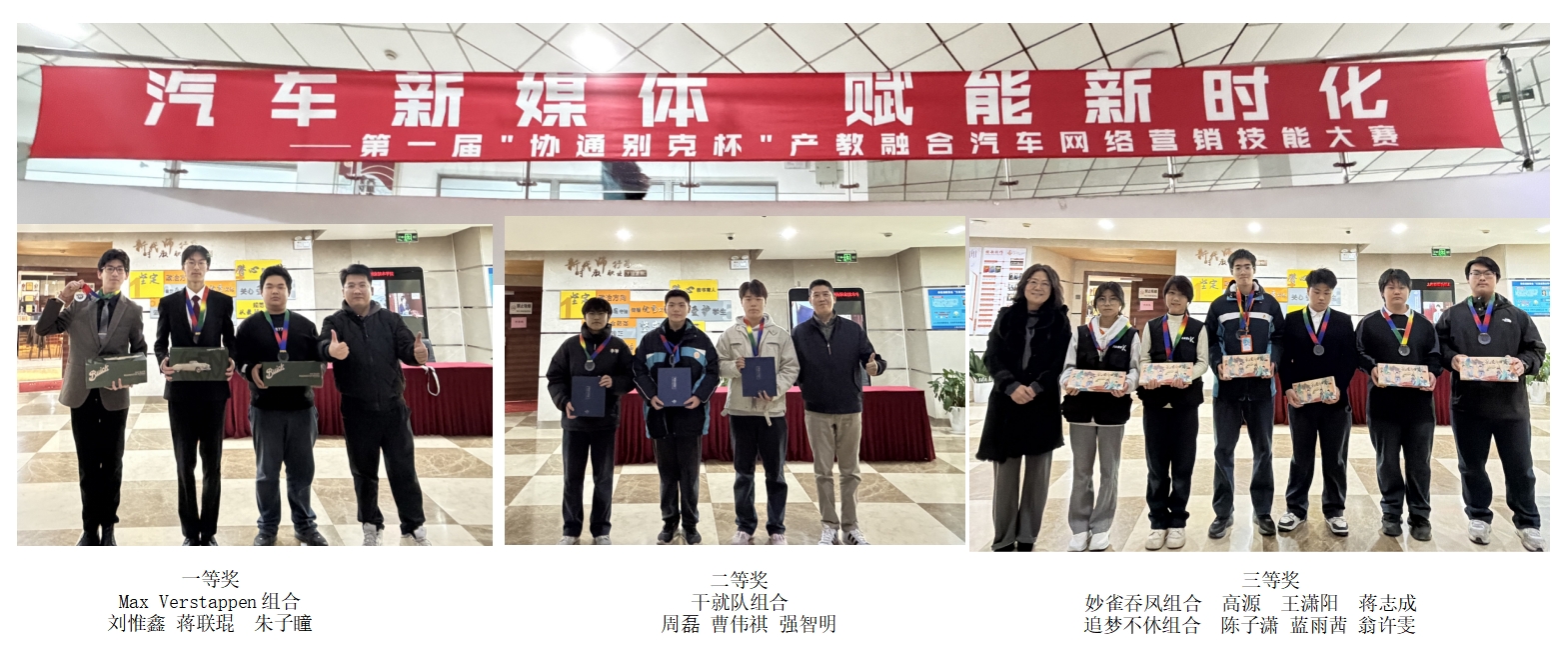 最后学生处副主任梁晓晴老师宣布了本次赛事的获奖名单。一等奖是 Max Verstappen组合,二等奖是干就队组合,三等奖是妙雀吞凤组合和追梦不休组合。颁奖嘉宾分别是上海协通汽车销售有限公司新媒体总监张迪、办公室主任 李达和曹杨职校党总支书记陈蔚。