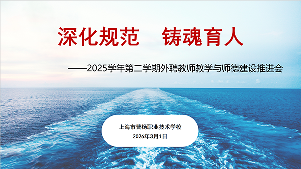 为深入贯彻落实立德树人根本任务,强化外聘教师队伍规范化建设,助力上海职业教育高质量发展,2026年3月1日下午,上海市曹杨职业技术学校召开外聘教师开学工作会议。党总支书记陈蔚、校长殷时余、副校长缪建华,督导室、教务处、人事处负责人,各专业部主任、相关教研组长及全体外聘教师齐聚一堂,共话育人使命,共商新学期教学工作。
