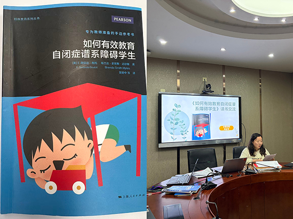 第四位是周金锭老师,她分享的是美国自闭症领域经典著作《如何有效教育自闭症谱系障碍学生》。周老师从科学认知、结构化教学、积极行为支持、社会交往沟通、家校协同五个方面系统拆解,并结合班级中踮脚尖走路、刻板行为、感官敏感等真实案例,介绍了视觉化日程、图片交换系统、分层教学等落地教学方法。周老师提到:“每个自闭症孩子都有独特的行为模式,我们要做的,是用科学与爱为他们搭建融入世界的桥梁”。
