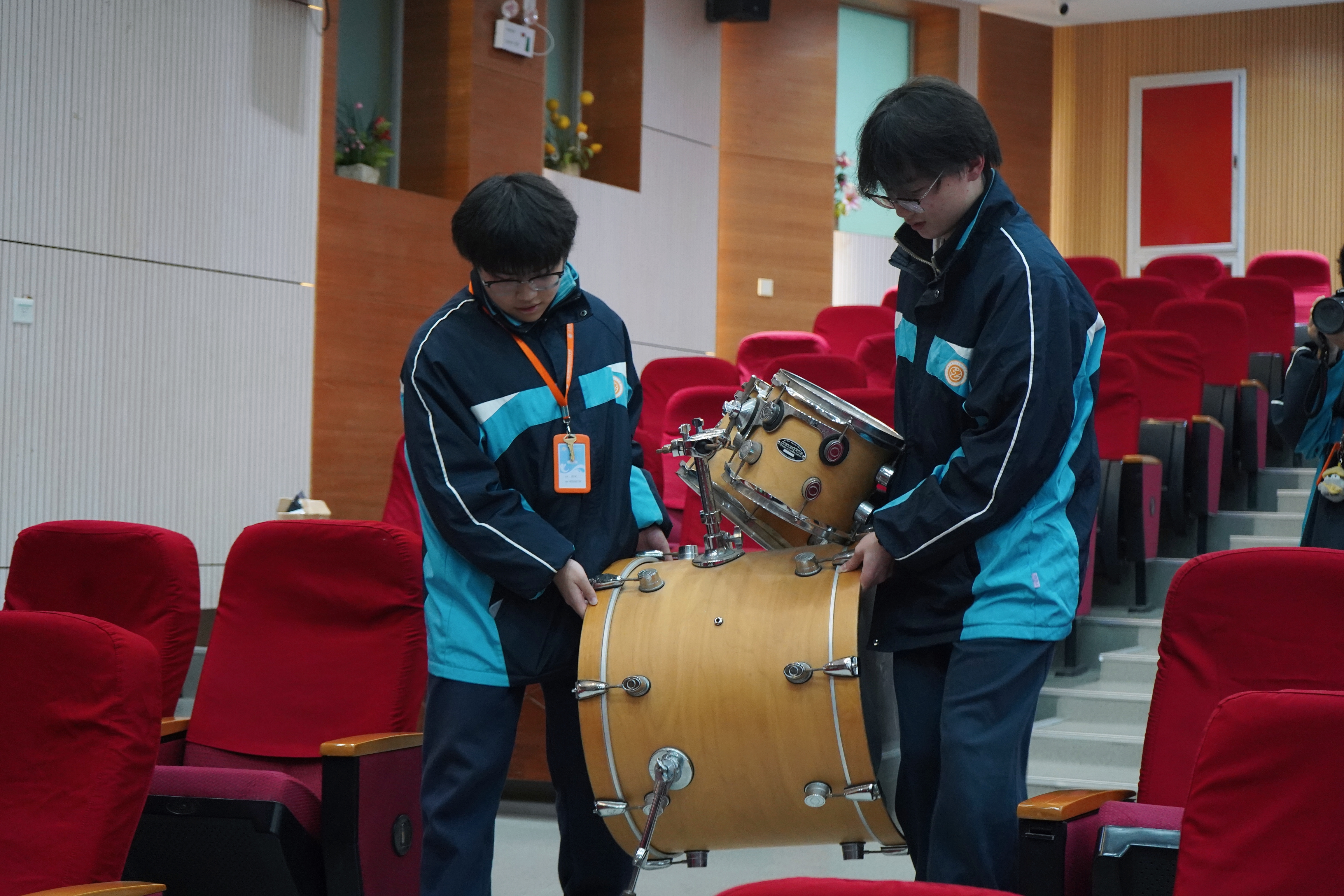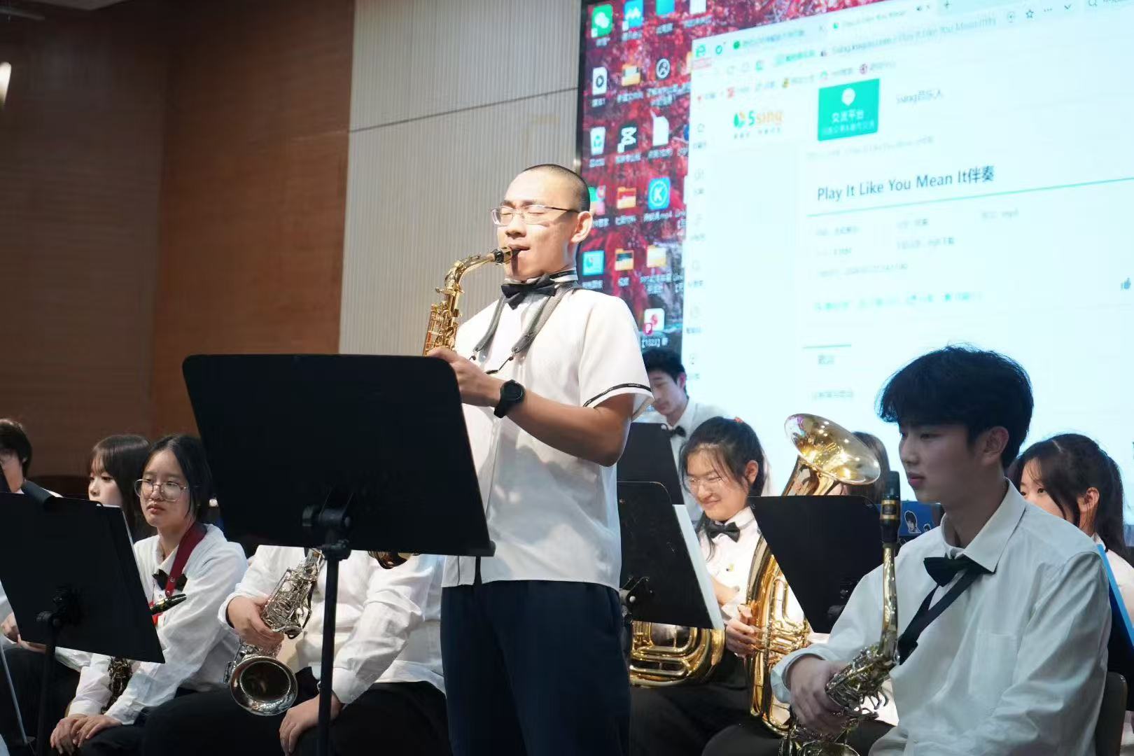 当晚,50名星光管乐团的乐手在学校师生热切期待中抵达校园,在指挥陈其然老师的带领下,早早进入状态,进行演出前的精心准备。与去年相比,乐团规模进一步扩大,演奏阵容更为完整,展现了该团一年多来的成长与积淀。更令人瞩目的是,本次演出中多了一位特殊的演奏者——来自曹杨职校25数媒班的包皓宇同学,他以萨克斯手的身份加入乐团,真正实现了“校团融合”的跨越,体现出该活动在推动学生从观众到参与者身份转变上的积极尝试。