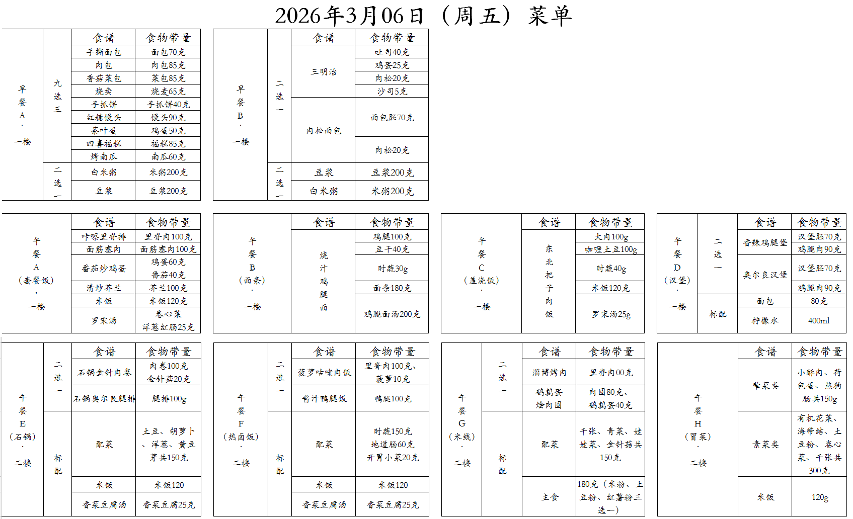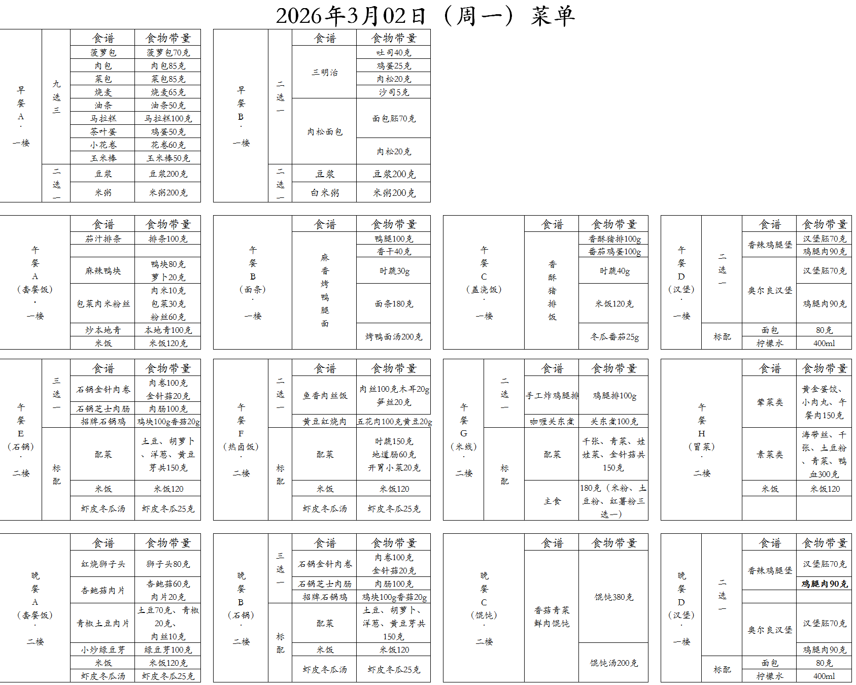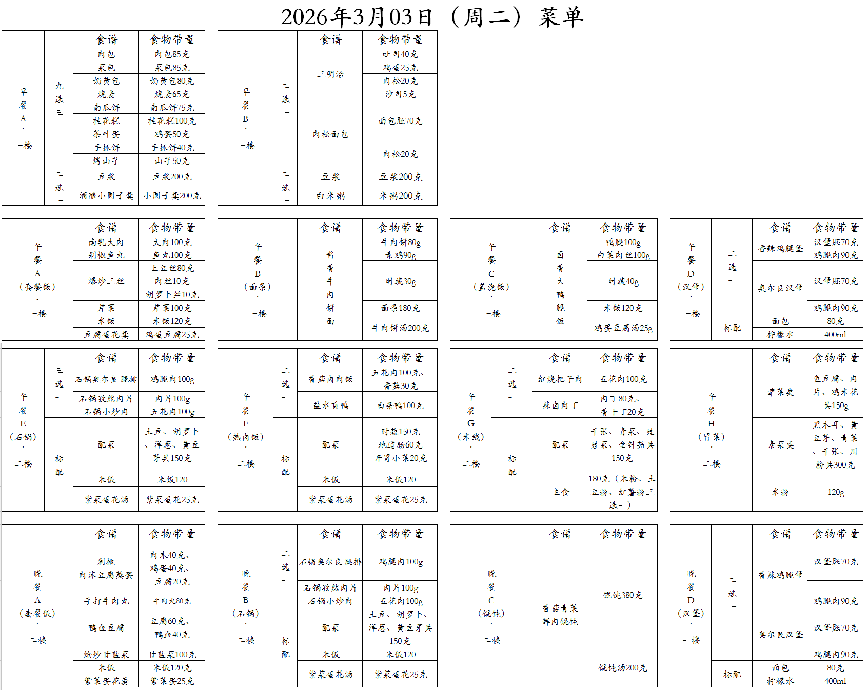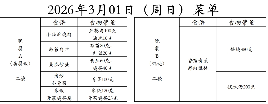 每周菜谱 第1周菜谱公示(3.1-3.6)