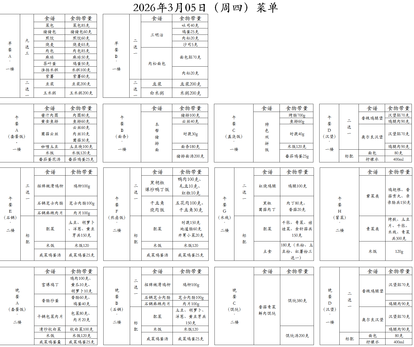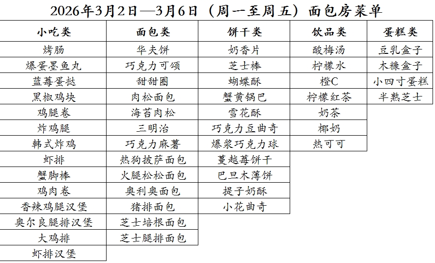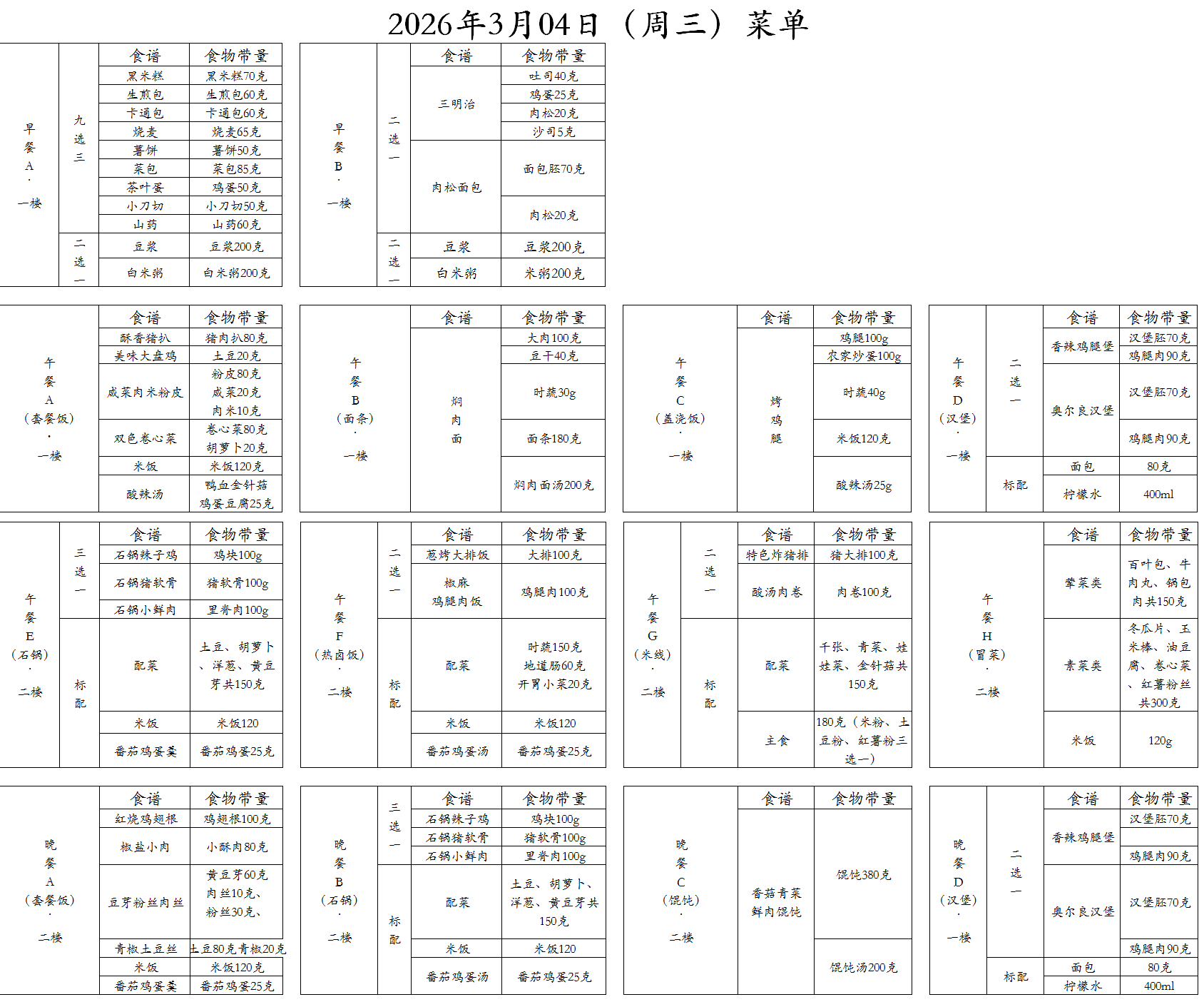 每周菜谱 第1周菜谱公示(3.1-3.6)