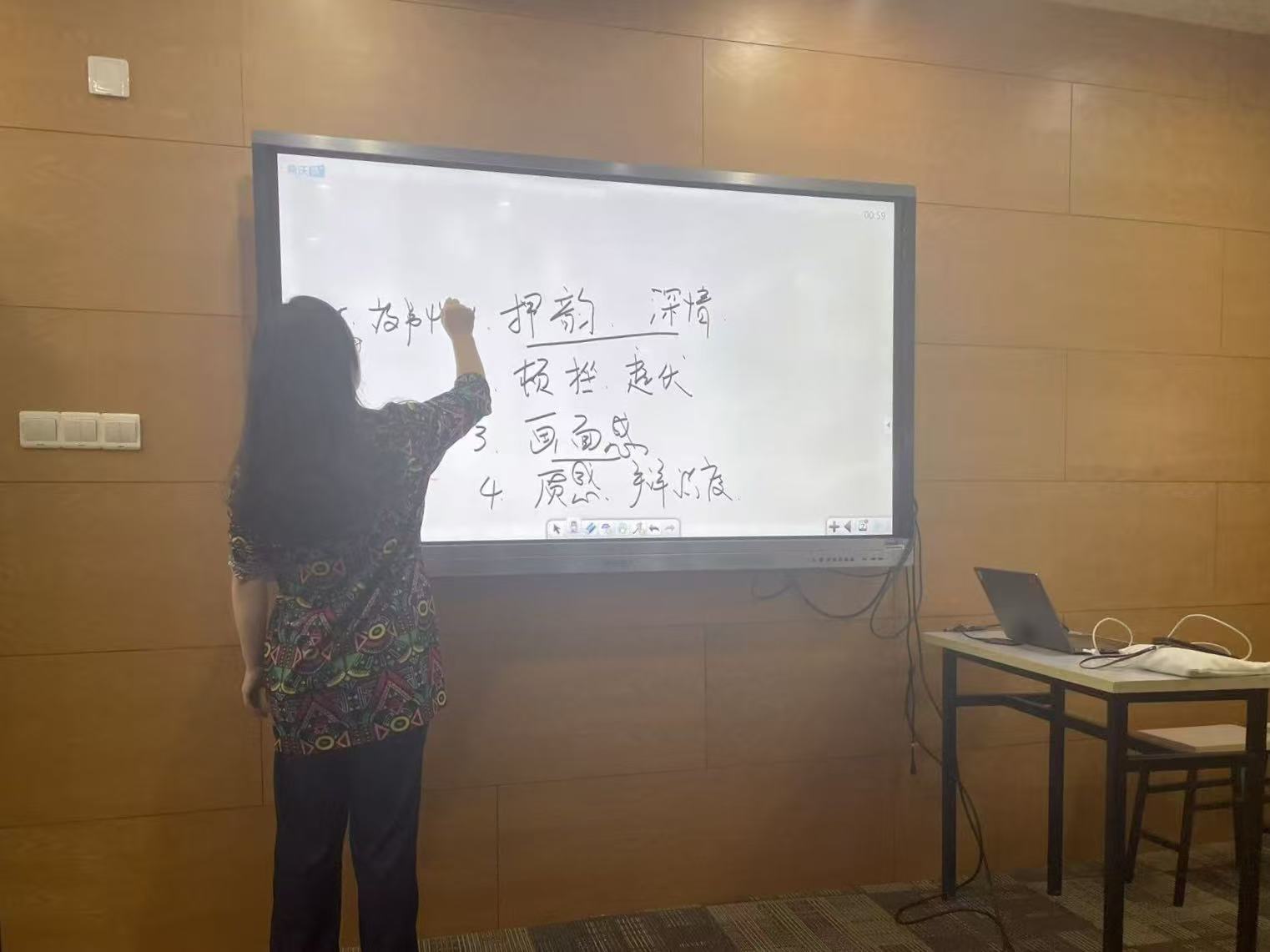 随后,邵老师详细讲解了朗诵的关键技巧。一是注重押韵与抑扬顿挫,让语句富有节奏感,避免平淡无味;二是要营造画面感,通过声音描绘场景,让听众仿佛身临其境;三是突出故事性,挖掘文字背后的情感与故事,引发听众共鸣;四是选择契合的背景音乐,用旋律烘托氛围,增强朗诵感染力;同时,她还特别提醒社员们,日常要注意护嗓,保持良好的发声状态,才能更好地完成朗诵。