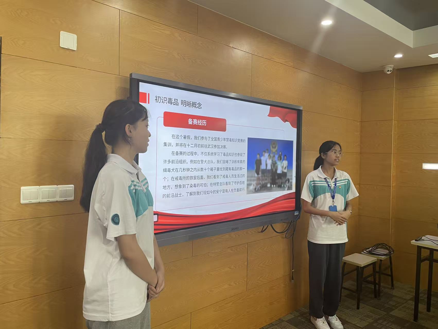 随后,她们结合虎门销烟这一经典历史案例,生动讲述了先辈们抵御毒品的坚定决心,强调在当今社会,大家更要时刻保持防范意识,坚决抵制毒品诱惑。同时,张可依、张莹还分享了暑期参加全国青少年禁毒知识竞赛集训的经历,以及参观警犬基地、戒毒所、特警总队的所见所闻。从警犬精准排查毒品,到戒毒人员懊悔的自述,再到特警队员严谨的工作状态,一个个真实场景让社员们深刻意识到禁毒工作的重要性与紧迫性,也进一步坚定了大家远离毒品、守护健康的信念。