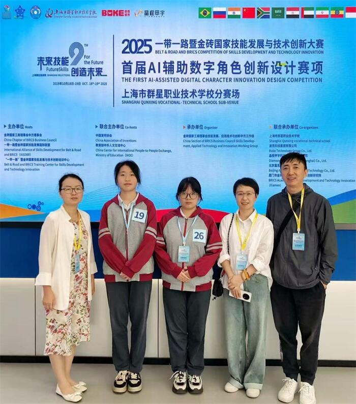 近日,2025一带一路暨金砖国家技能发展与技术创新大赛首届AI辅助数字角色创新设计大赛圆满落幕。曹杨职校商贸会展专业部师生团队凭借协同作战的拼搏精神与过硬的专业实力惊艳赛场,不仅斩获学生组、教师组多项大奖,更彰显了中职院校在AI设计人才培养领域的扎实成果。其中,会展策划与管理专业学生张欣怡脱颖而出,摘得学生组第一名,陈奕萱获学生组第三名;殷蓓蕾老师勇夺教师组桂冠,程明老师斩获教师组第三名,为学校与专业部赢得荣誉。