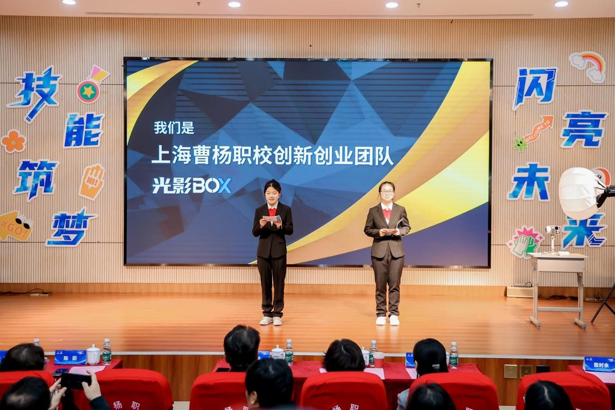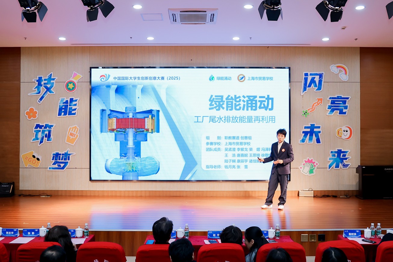 现场,来自上海市曹杨职业技术学校的中国国际大学生创新大赛全国总决赛金奖项目《光影BOX——影视光效生态聚合解决方案创导者》与上海市贸易学校的上海赛区金奖项目《绿能涌动——工厂尾水排放再利用》进行“优秀双创项目路演”。前者以AI技术赋能影视光效设计,助力文化创意产业升级;后者聚焦工业环保,通过尾水循环利用推动绿色制造。项目团队以专业实践回应产业需求,展现了职教学子“学以致用、创以致新”的硬核实力。