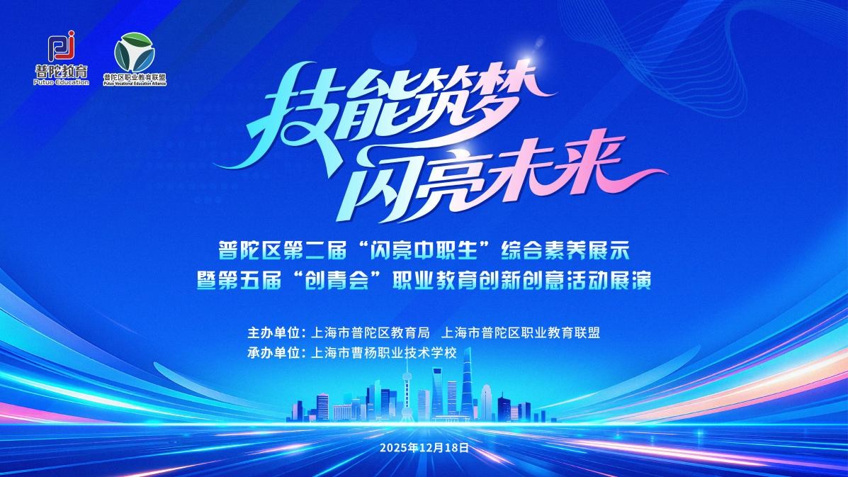 2025年12月18日下午,以“技能筑梦 闪亮未来”为主题的第二届“闪亮中职生”综合素养展示暨第五届“创青会”职业教育创新创意活动展演在曹杨职校举行。区教育工作党委副书记、教育局局长赵平,市教委职教处四级调研员谢俊,区教育局副局长王贞飞出席。区内中职学校校领导、师生代表参加。