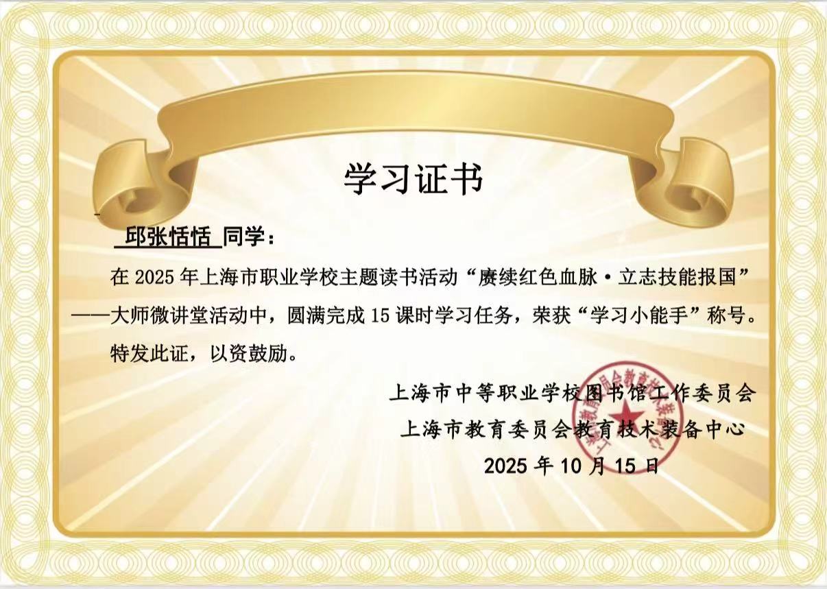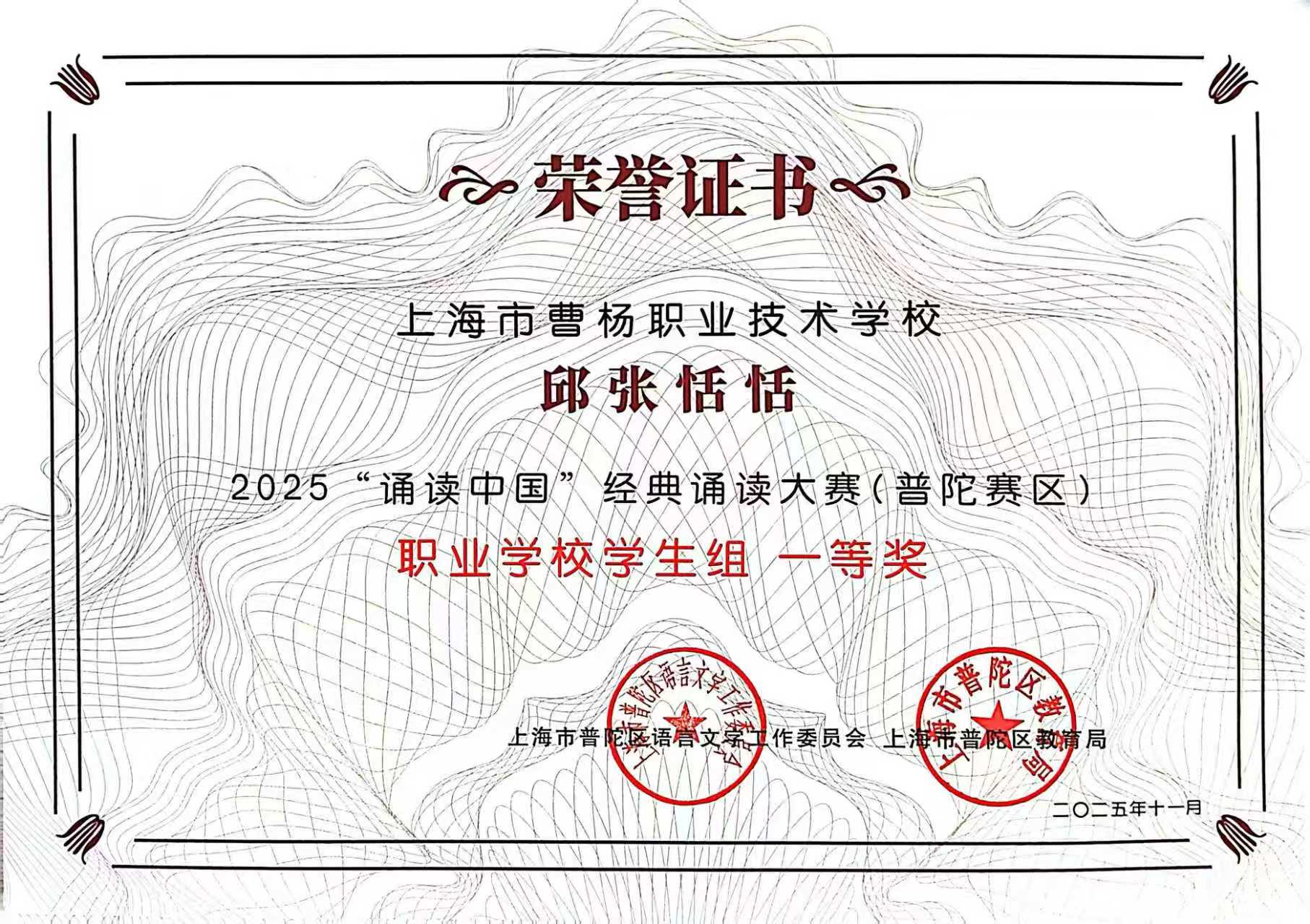 收到三份荣誉证书时,邱张恬恬内心满是激动与感恩。“学习小能手”称号让她明白坚持学习的意义,更坚信技能与知识是报国的基石;“烽火记忆,红色传承”作品征集活动三等奖,是对她将历史感悟转化为文字表达的肯定;“诵读中国”大赛普陀赛区一等奖,则让她感受到经典传播的强大力量。