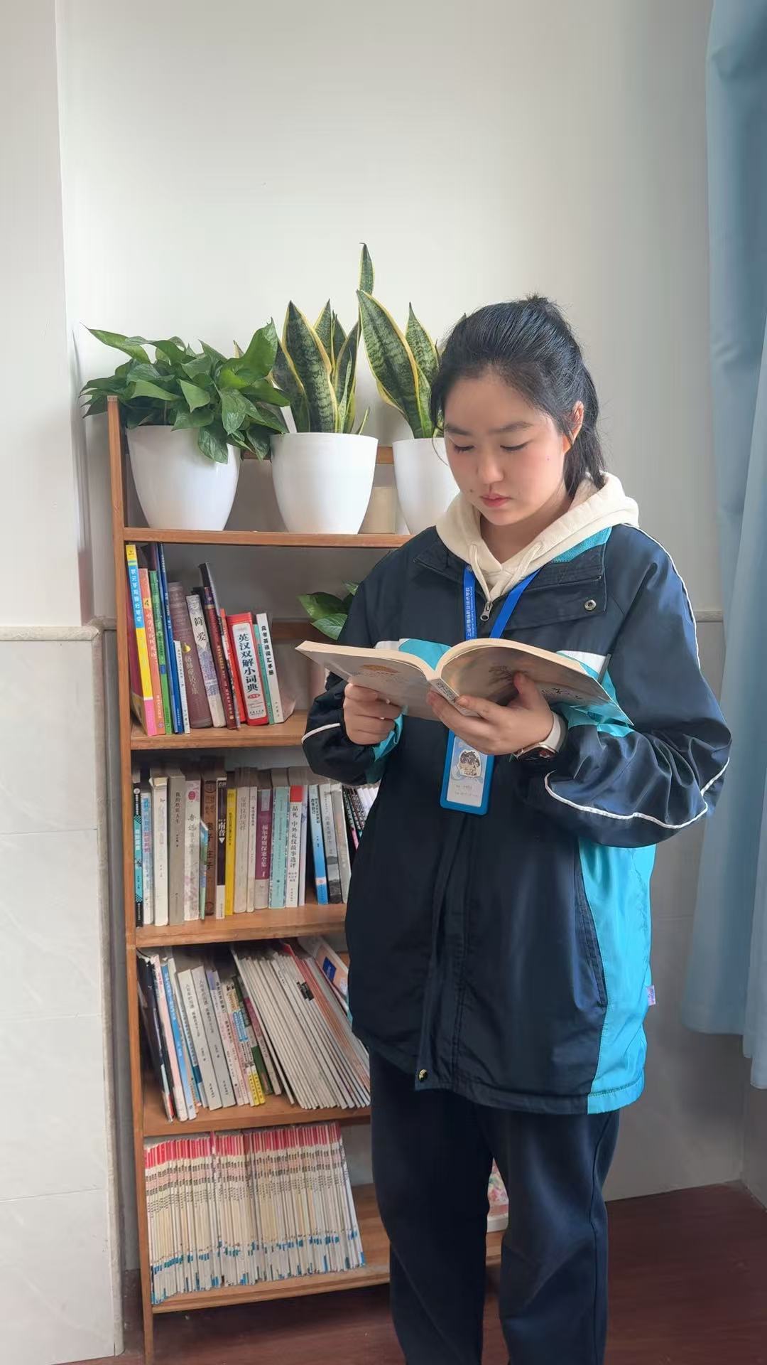 而2025“诵读中国”经典诵读大赛的参赛契机,源于朗诵社日常活动。方志敏先生的《可爱的中国》是她心中的红色经典,书中对祖国的赤诚热爱与坚定信仰,与主题读书活动传递的红色精神高度契合。在社团指导老师王秀鹏的鼓励下,她决定以朗诵为载体,让更多人感受经典的力量,遂选定篇目报名参赛。