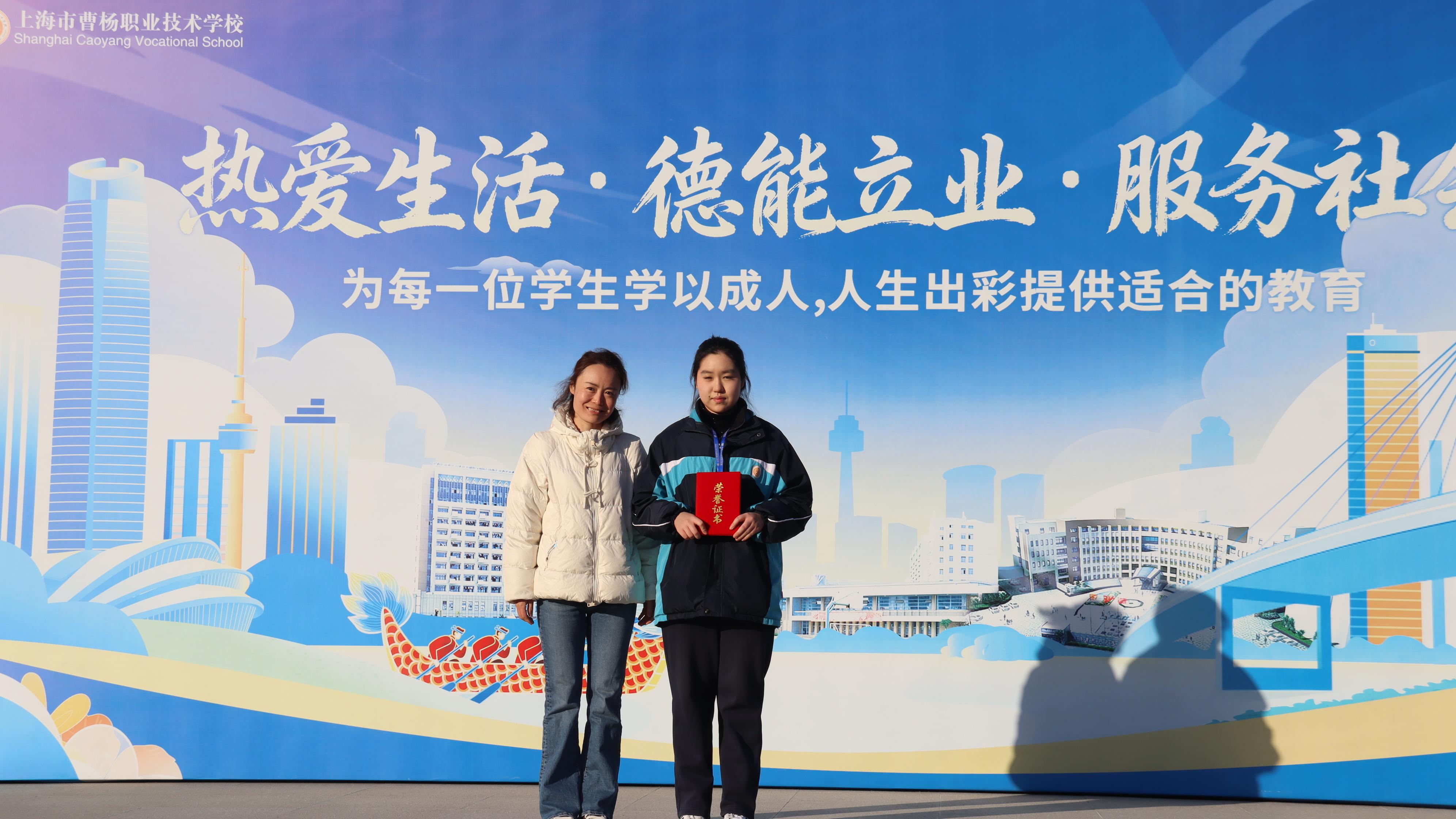 此外,仪式还对近期在校外活动中取得佳绩的同学进行了祝贺。在2025年“诵读中国”经典朗诵大赛普陀赛区中,24中本班邱张恬恬同学荣获职业学校学生组一等奖,齐白玉、王宇帆两位同学获得三等奖。在2025年上海市职业学校主题读书活动中,邱张恬恬和张焱焱两位同学荣获“学习小能手”称号。校团委书记梁晓晴老师为以上同学颁奖。