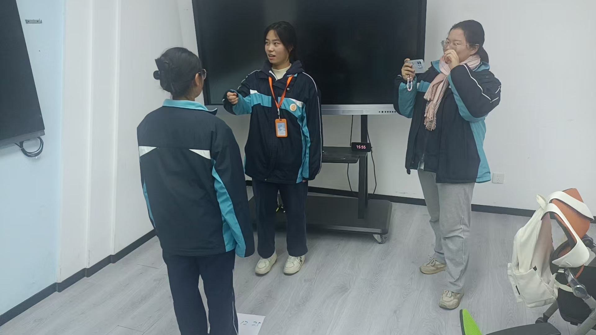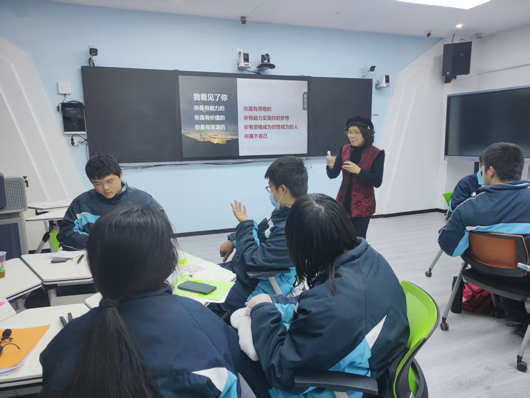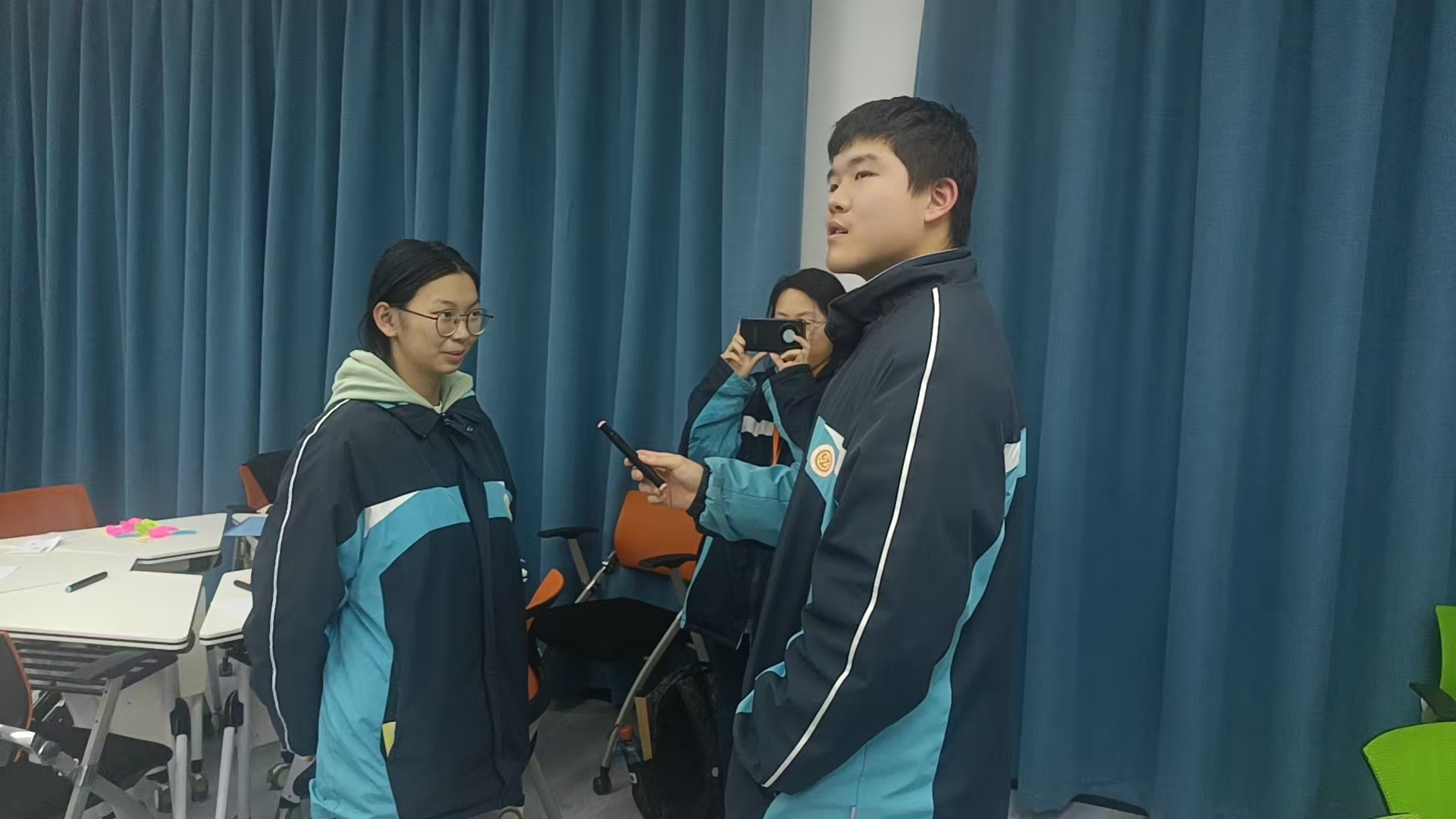 在第三个赋能环节中,同学们以游戏的形式,一下跳到了5年后的2030年12月25日。一位同学扮演记者,采访亲历者,这5年来发生了什么,亲历者回看5年来,取得了什么成果,遇到怎样的挑战,付出了什么努力,过程中提高了哪些能力。扮演纪实摄影师的同学用手机拍下这段采访。活动中,同学们都认真投入到设定的年份和角色中,沉浸在未来的岁月,畅想5年内可能会经历的事件。
