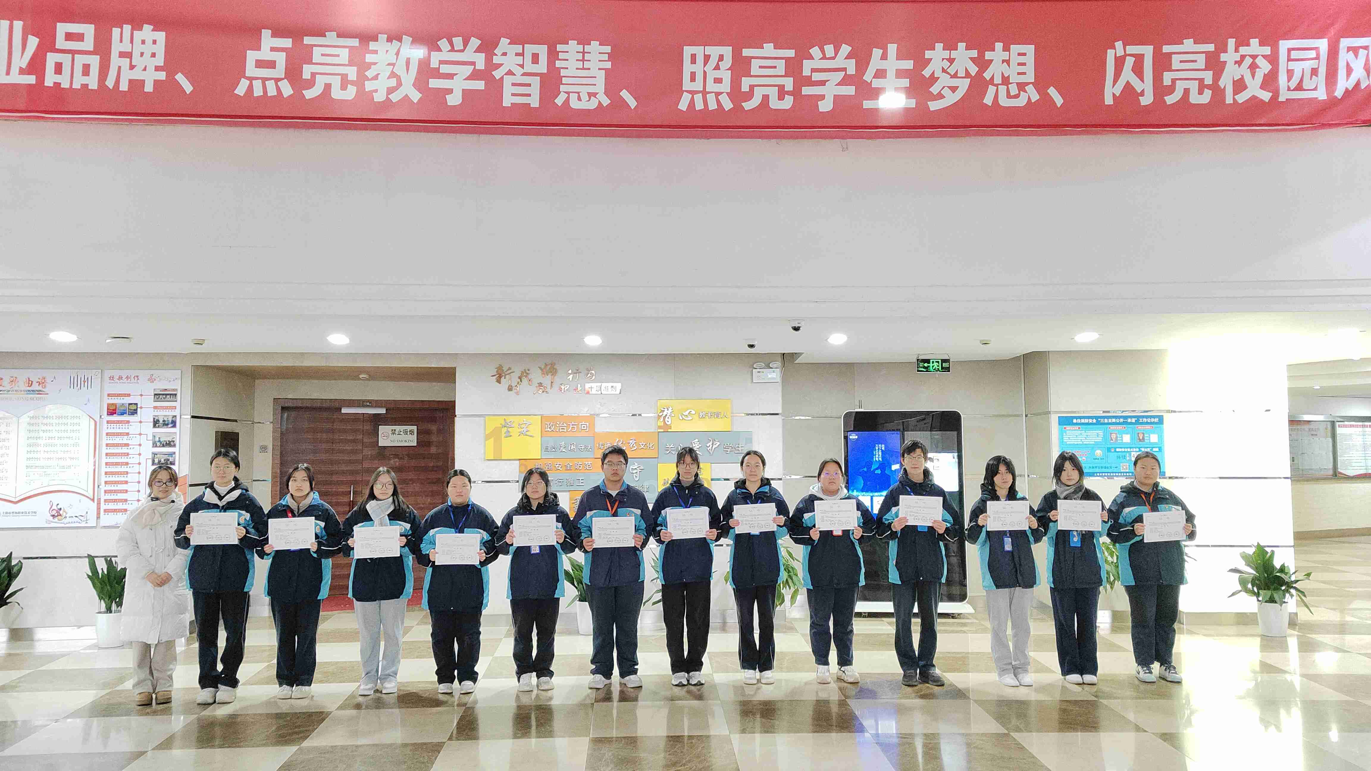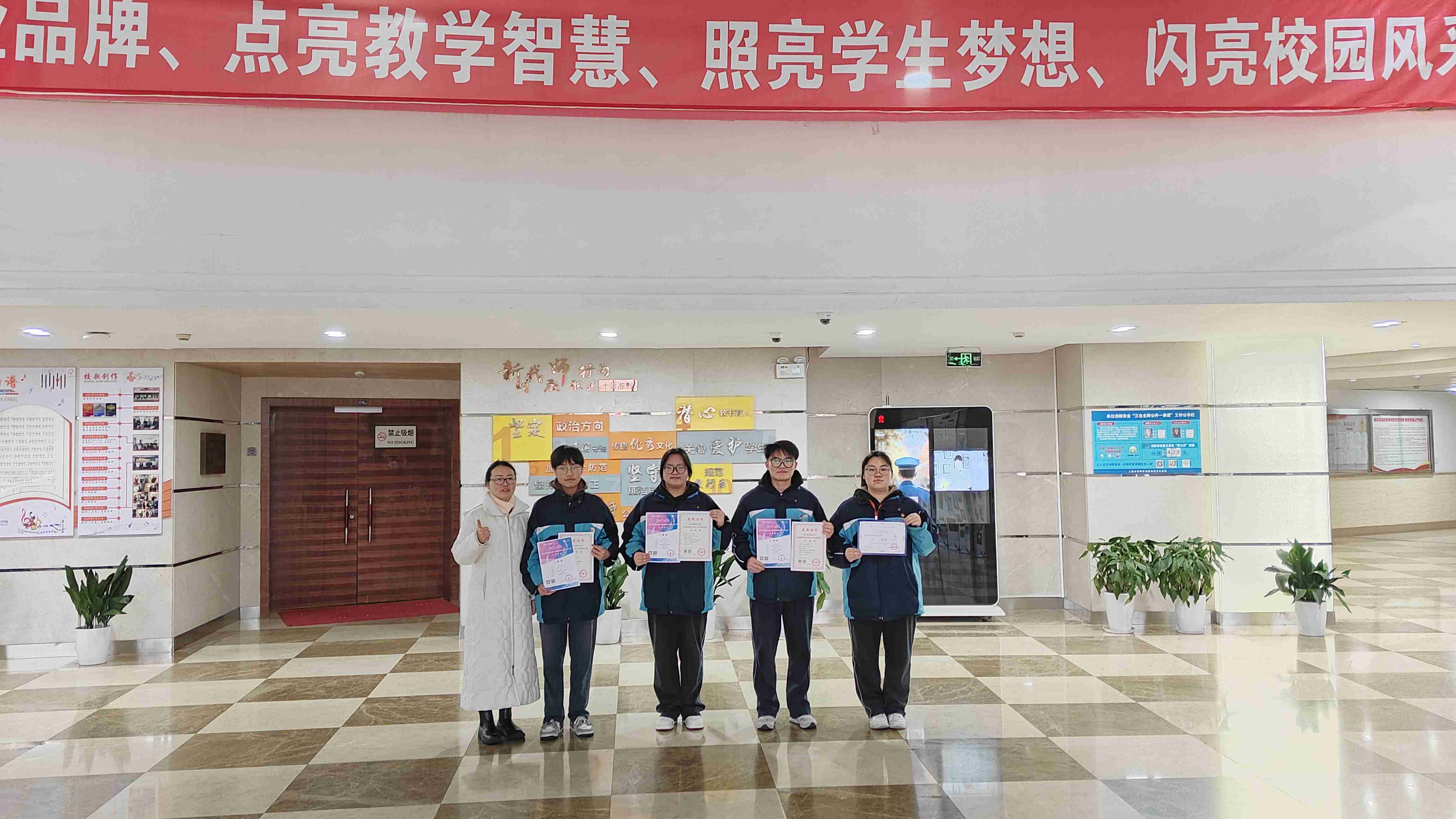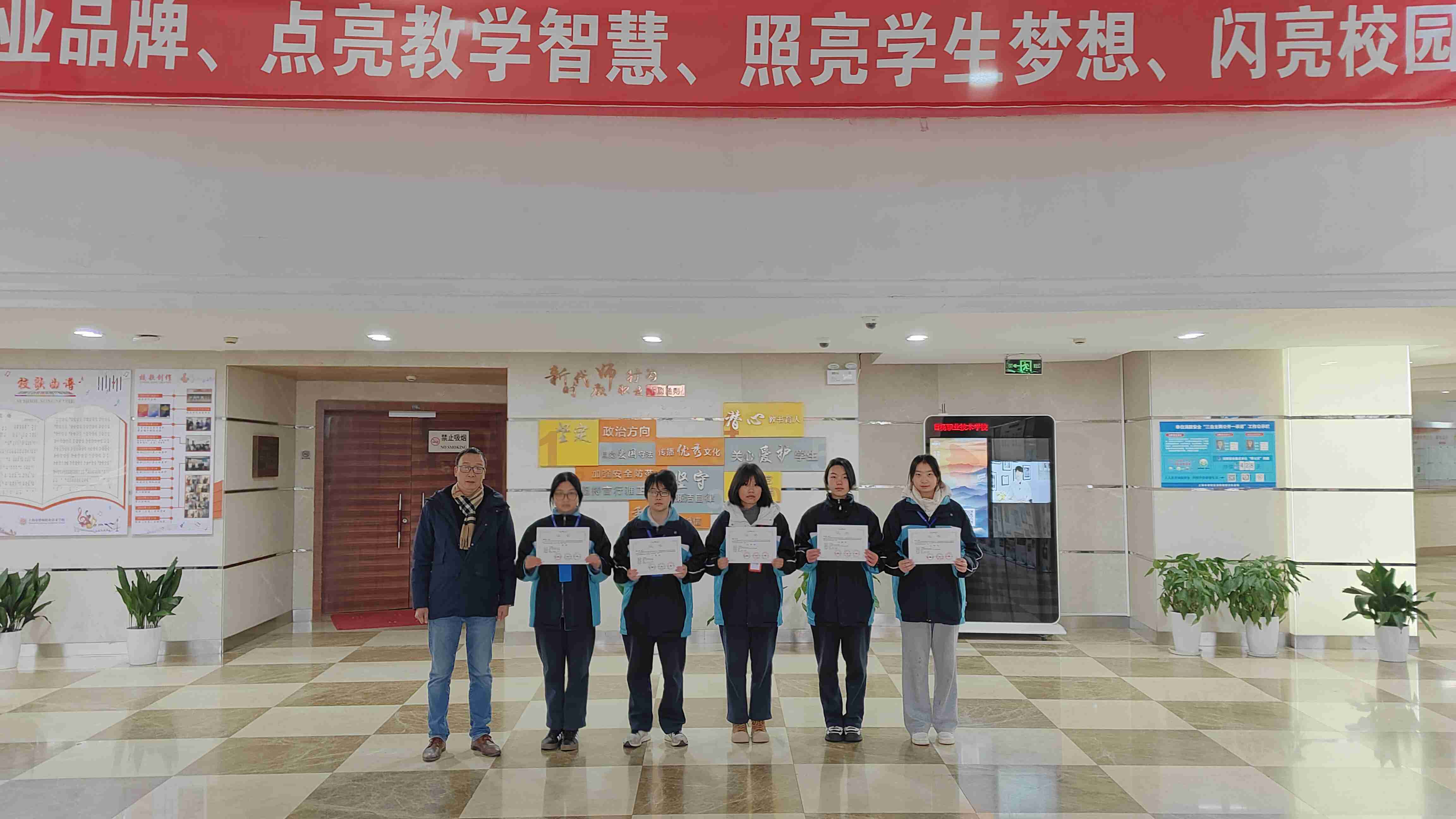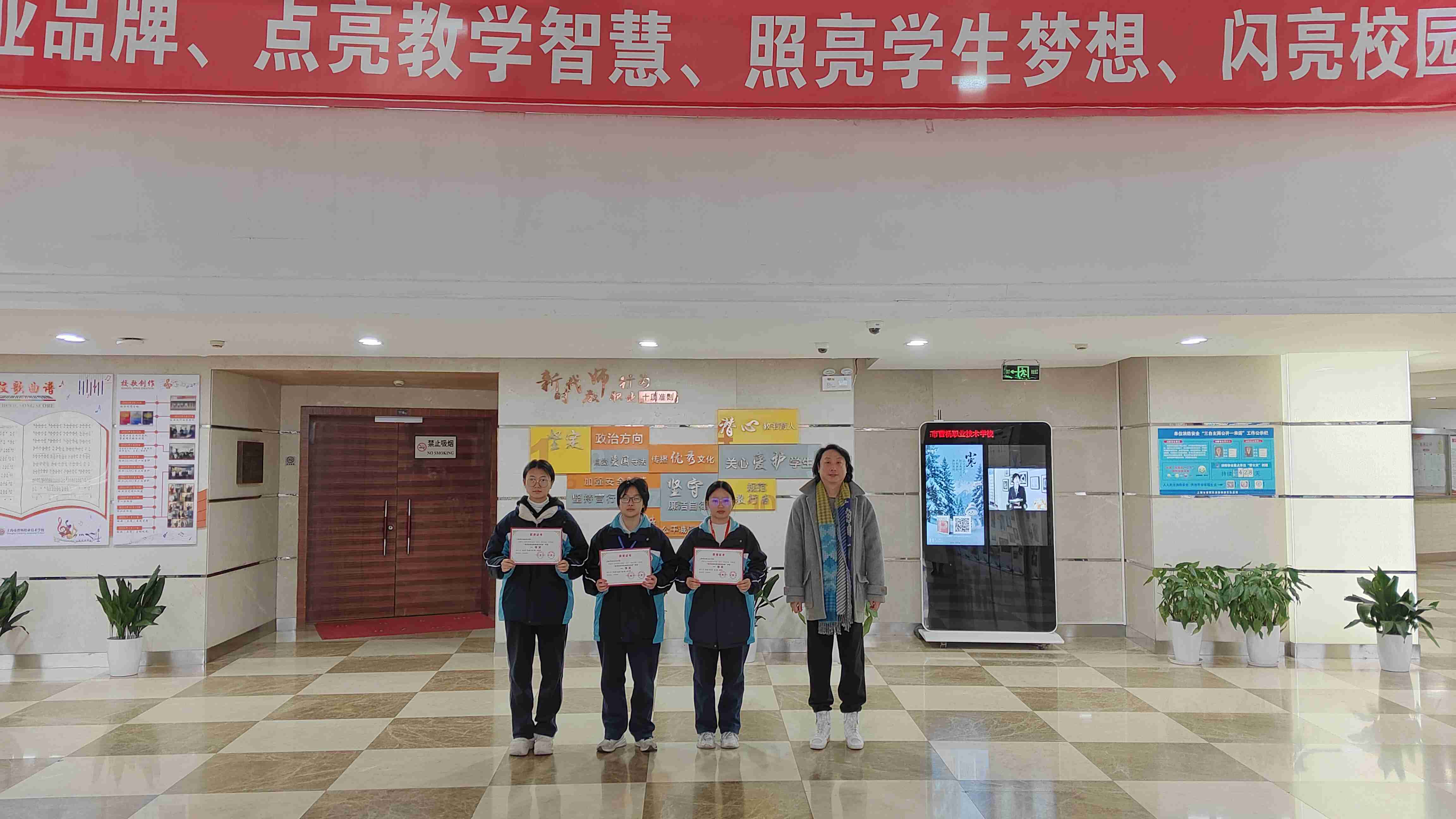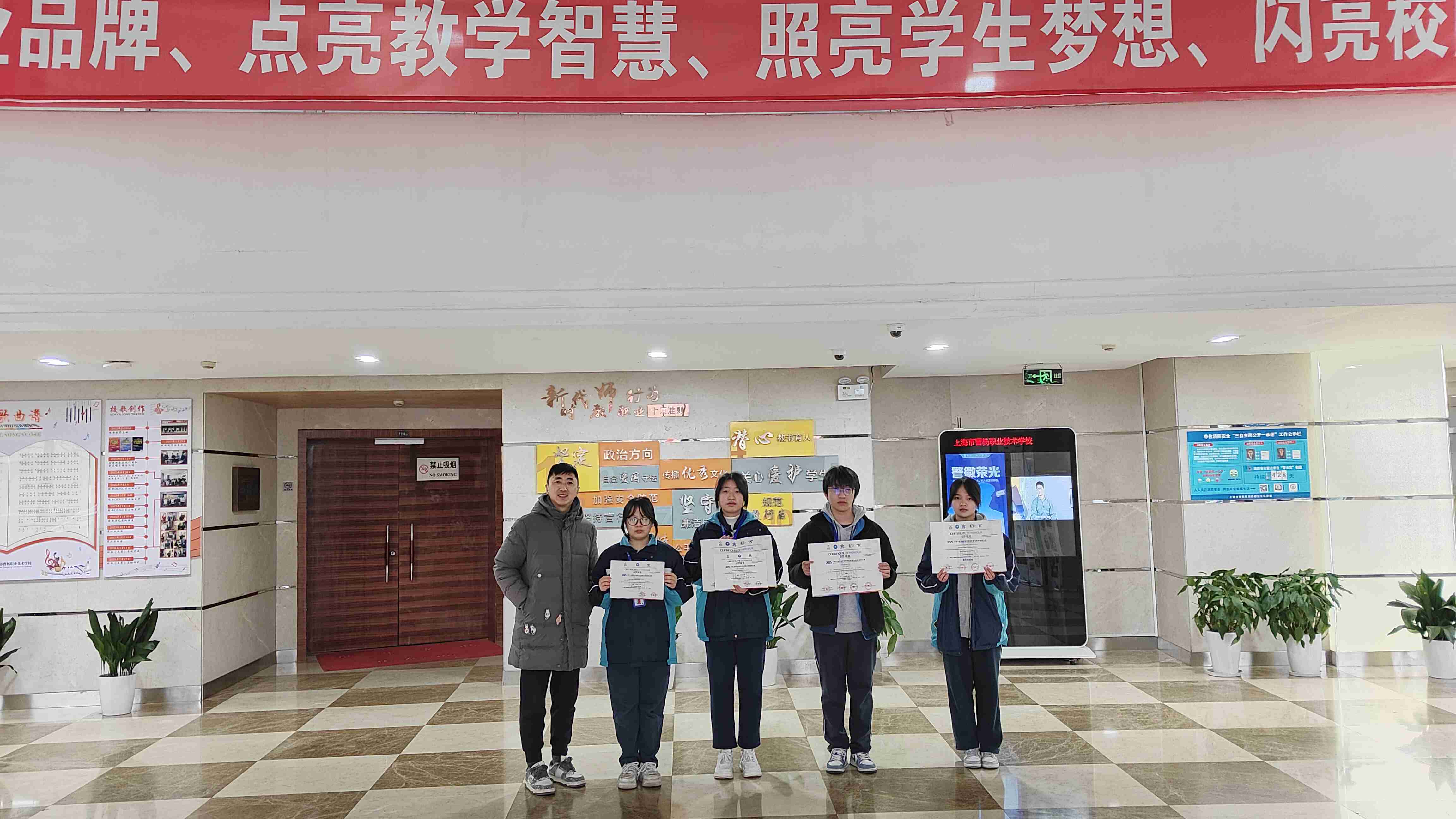 在第二十二届上海未来工程师大赛普陀区赛中,沈菲颖同学获得二等奖。在第13届未来设计师全国高校数字艺术设计大赛中,23会展2班朱海雁、陈兴兴和24数媒班王梓轩三位同学获得上海赛区二等奖、全国总决赛三等奖。由张艳老师为他们颁奖。