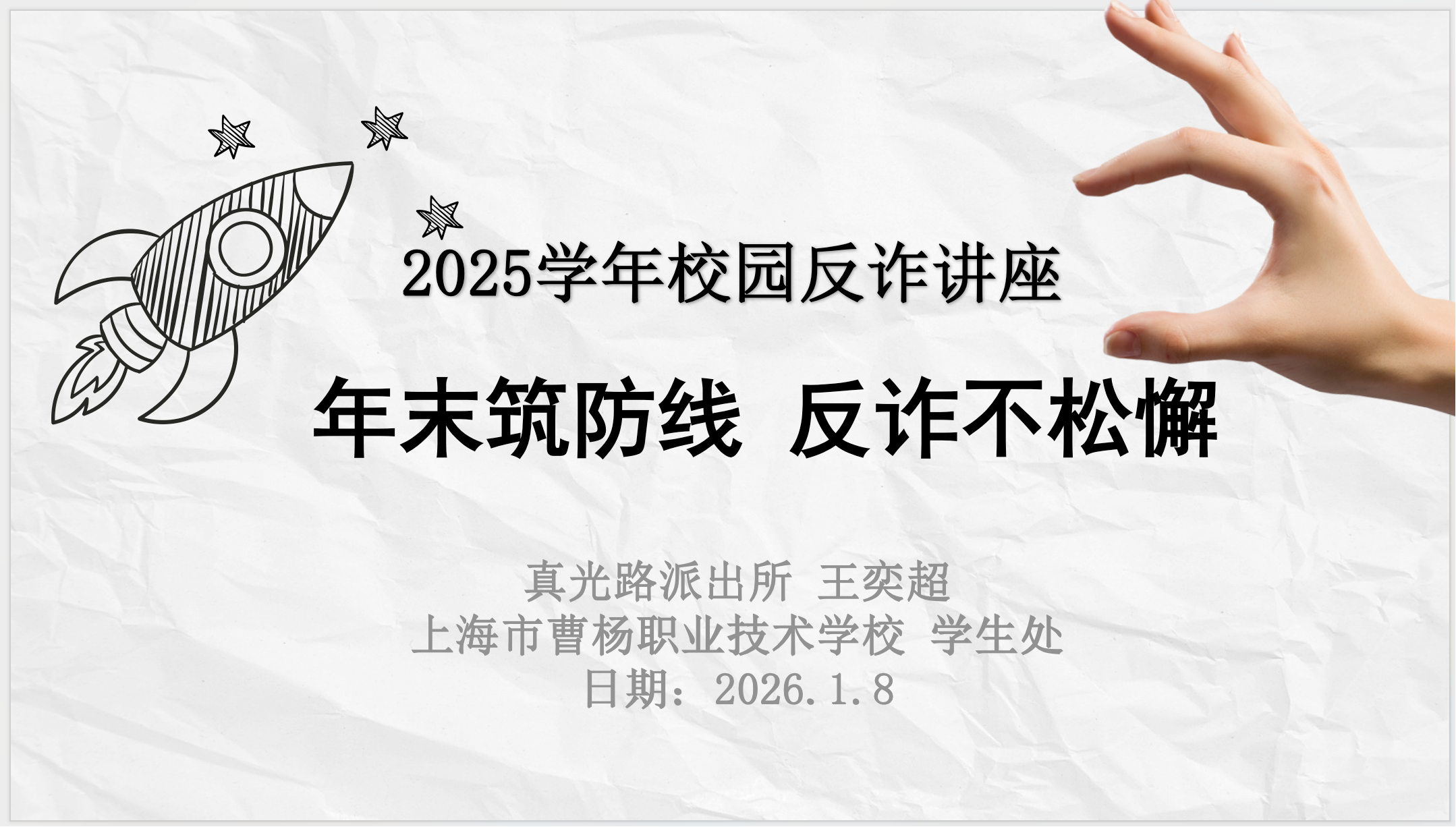 近日,上海市曹杨职业技术学校邀请校外法治辅导员、普陀区公安分局真光路派出所王奕超警官来校,为师生开展了一场主题鲜明的反诈宣传教育讲座。讲座围绕学生群体高发的电信网络诈骗类型展开,通过真实案例剖析与防范技能讲解,助力学生提升识骗防骗能力,筑牢校园反诈安全防线。