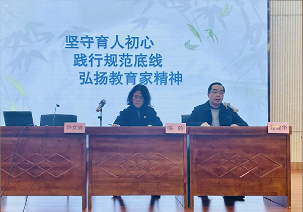 副校长缪建华在发言中围绕《坚守育人初心,践行规范底线,弘扬教育家精神》主题,从课堂纪律的管理、教学规范实施、教育家精神的弘扬三个关键词出发,对全体教师提出三点要求。他指出,教师是学生道德品格的塑造者,必须坚守育人初心,严守课堂纪律与教学规范,以身作则、言传身教。他呼吁广大教师将会议精神转化为行动的自觉,以师德师风建设为核心,用规范守护职业尊严,以高尚的道德情操和专业素养赢得学生信任,弘扬教育家精神,用情怀照亮育人之路。