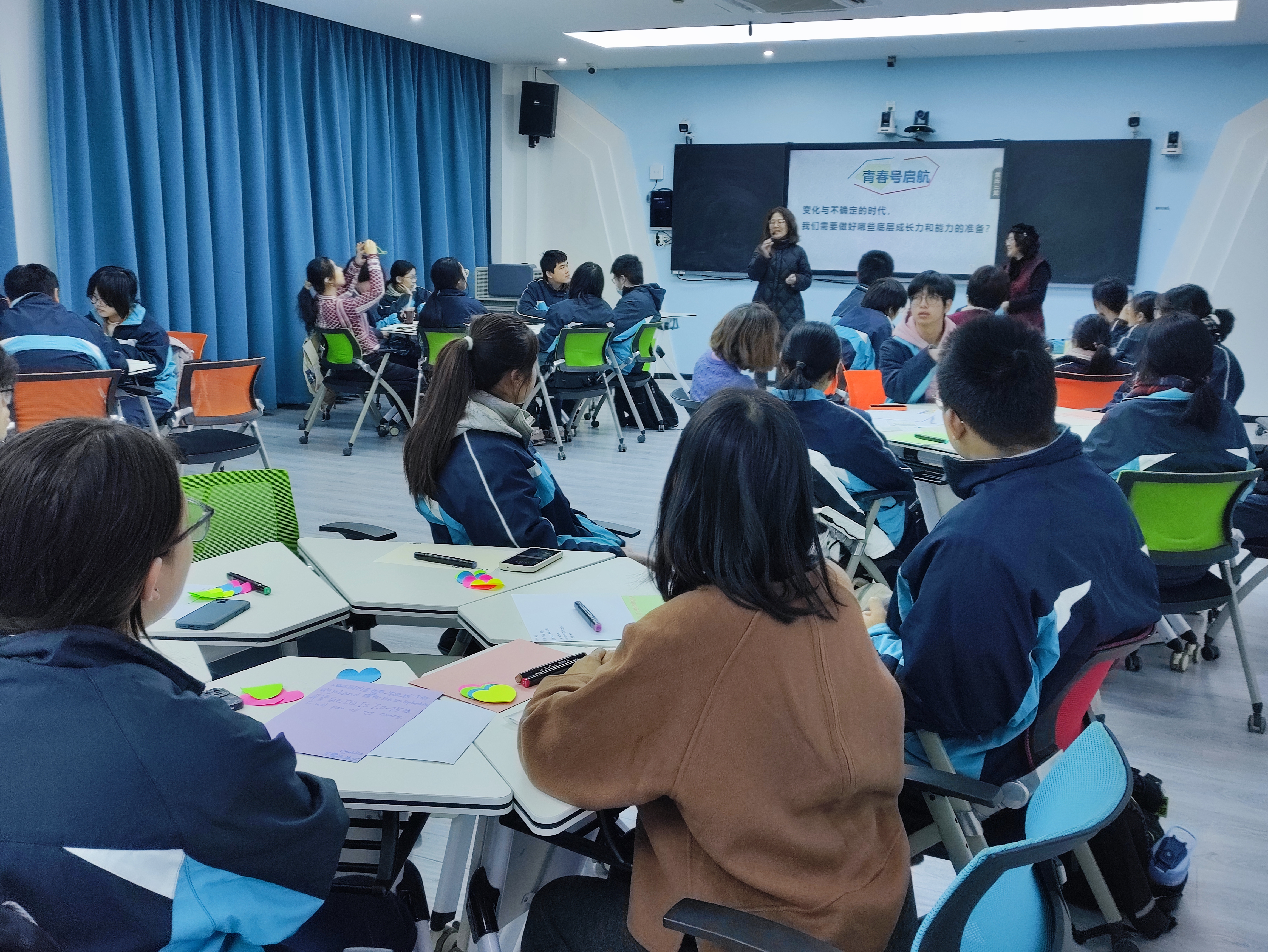 在第三个赋能环节中,同学们以游戏的形式,一下跳到了5年后的2030年12月25日。一位同学扮演记者,采访亲历者,这5年来发生了什么,亲历者回看5年来,取得了什么成果,遇到怎样的挑战,付出了什么努力,过程中提高了哪些能力。扮演纪实摄影师的同学用手机拍下这段采访。活动中,同学们都认真投入到设定的年份和角色中,沉浸在未来的岁月,畅想5年内可能会经历的事件。